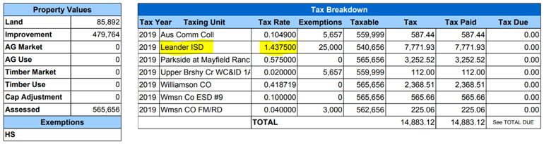 Below is an example showing the effect of Senate Bill 2. Notice that the Tax Rate for Leander ISD goes down each year: