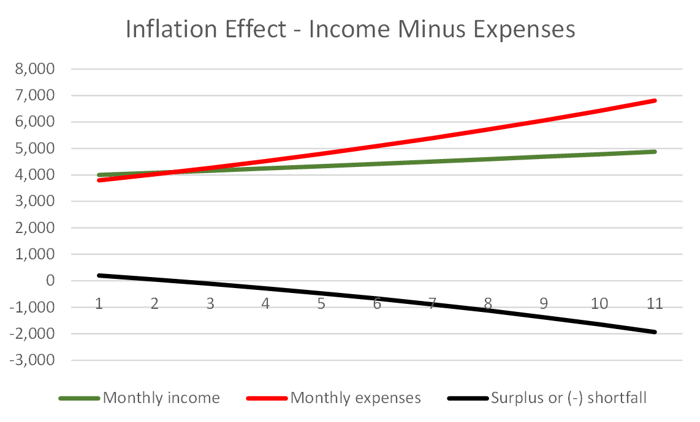 However, if their expenses increase 6% per year while their income only goes up 2% each year, by year three they are underwater and by year ten they are short almost $2,000 per month. Property taxes are just part of the increased expenses.
